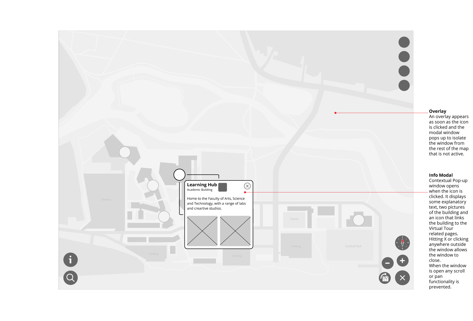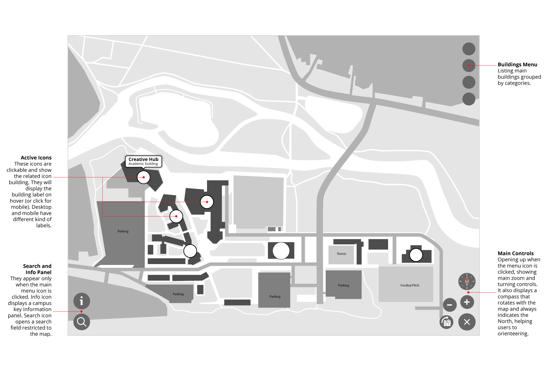 We ran a usability pre-test session using the interactive mock-up. Results were encouraging, even though minor issues emerged related to the hovering effect on desktop and to the labelling of the buildings. Some lack of visual affordances created some friction amongst the testers, so I had to redesign these bits and retest them.